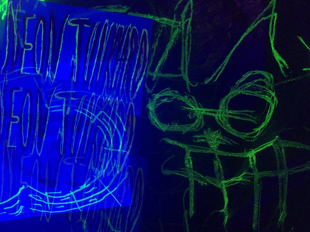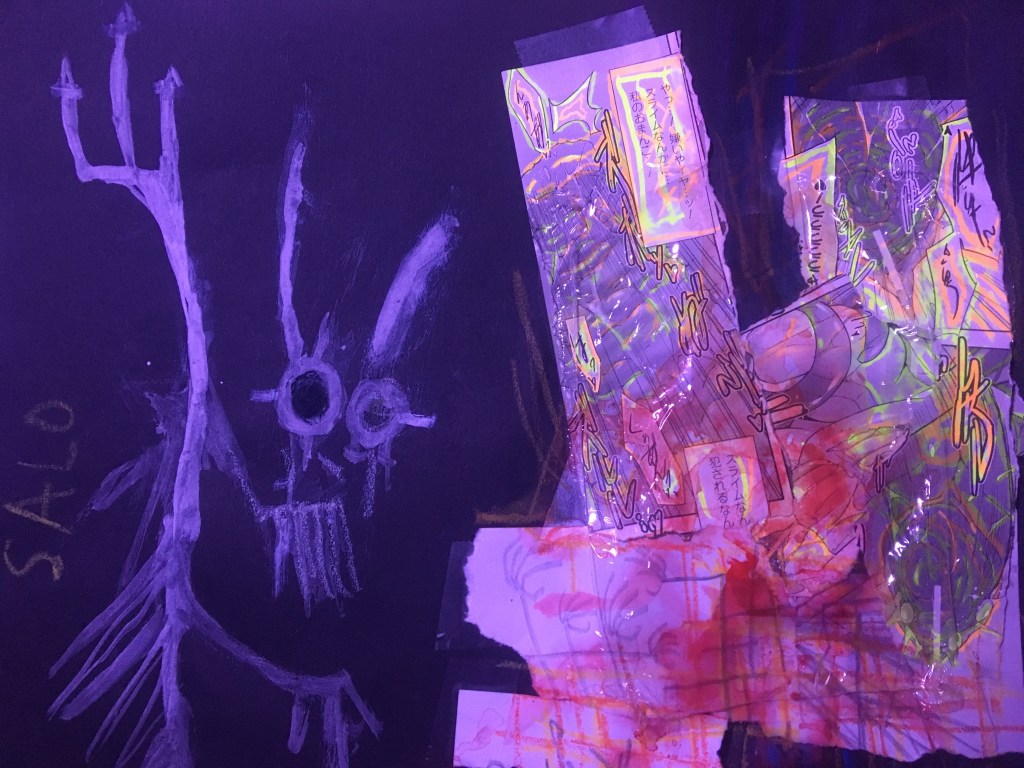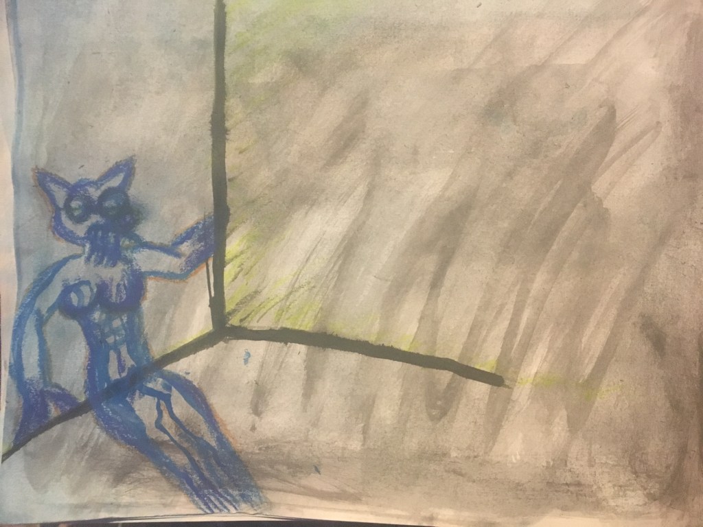 “Catlady Strung Down” Highlighter, ink, pastel